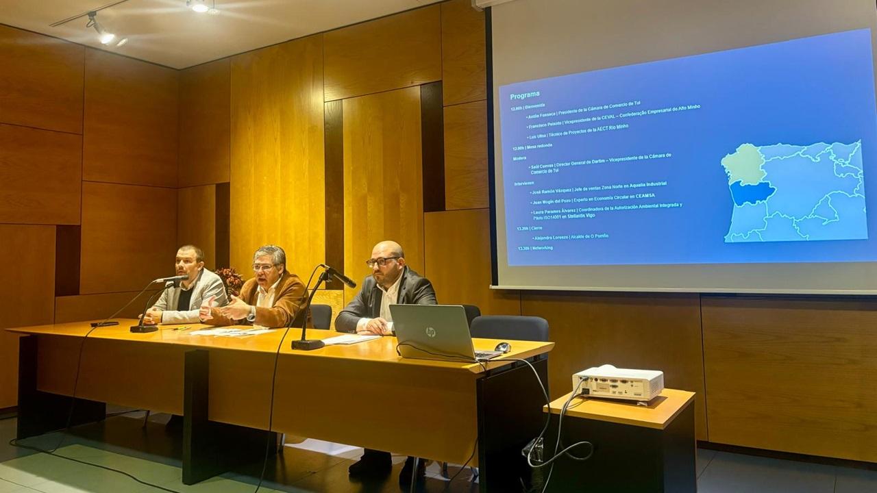 A continuación, tuvo lugar una mesa redonda moderada por Saúl Cuevas, Director General de Darlim y Vicepresidente de la Cámara de Comercio de Tui, en la que participaron, José Ramón Vázquez, Jefe de ventas Zona Norte en Aqualia Industrial, Juan Mogín del Pozo, Experto en Economía Circular en CEAMSA y, Laura Parames Álvarez, Coordinadora de la Autorización Ambiental Integrada y Piloto ISO14001 en Stellantis Vigo,