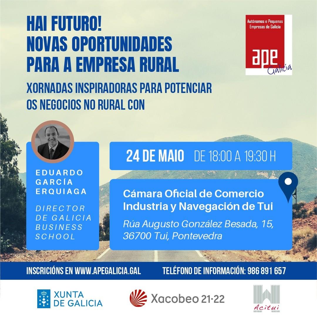 El próximo 24 de mayo, tendrá lugar la jornada ”Hai Futuro! Novas oportunidades para a empresa rural” con el director de Galicia Business School, Eduardo García Erquiaga. Tendrá lugar en la sede de la Cámara de Comercio de Tui y está organizada por APE Galicia. Si te...
